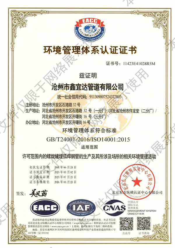 滄州市鑫宜達管道有限公司成立于2003年7月,坐落于滄州經濟開發(fā)區,占地面積40萬平方米,注冊資金1.81億元,是集螺旋鋼管生產、防腐加工以及無縫鋼管、卷板、帶鋼等品類鋼材經營銷售于一體的工貿型企業。公司現有員工400多人,其中,中高級技術職稱的人員達120余名。 滄州市鑫宜達管道有限公司擁有9條螺旋鋼管生產線和3PE防腐生產線,可生產直徑219--3640mm,壁厚5.5--28mm,最高鋼級X100的各種規(guī)格防腐螺旋鋼管...